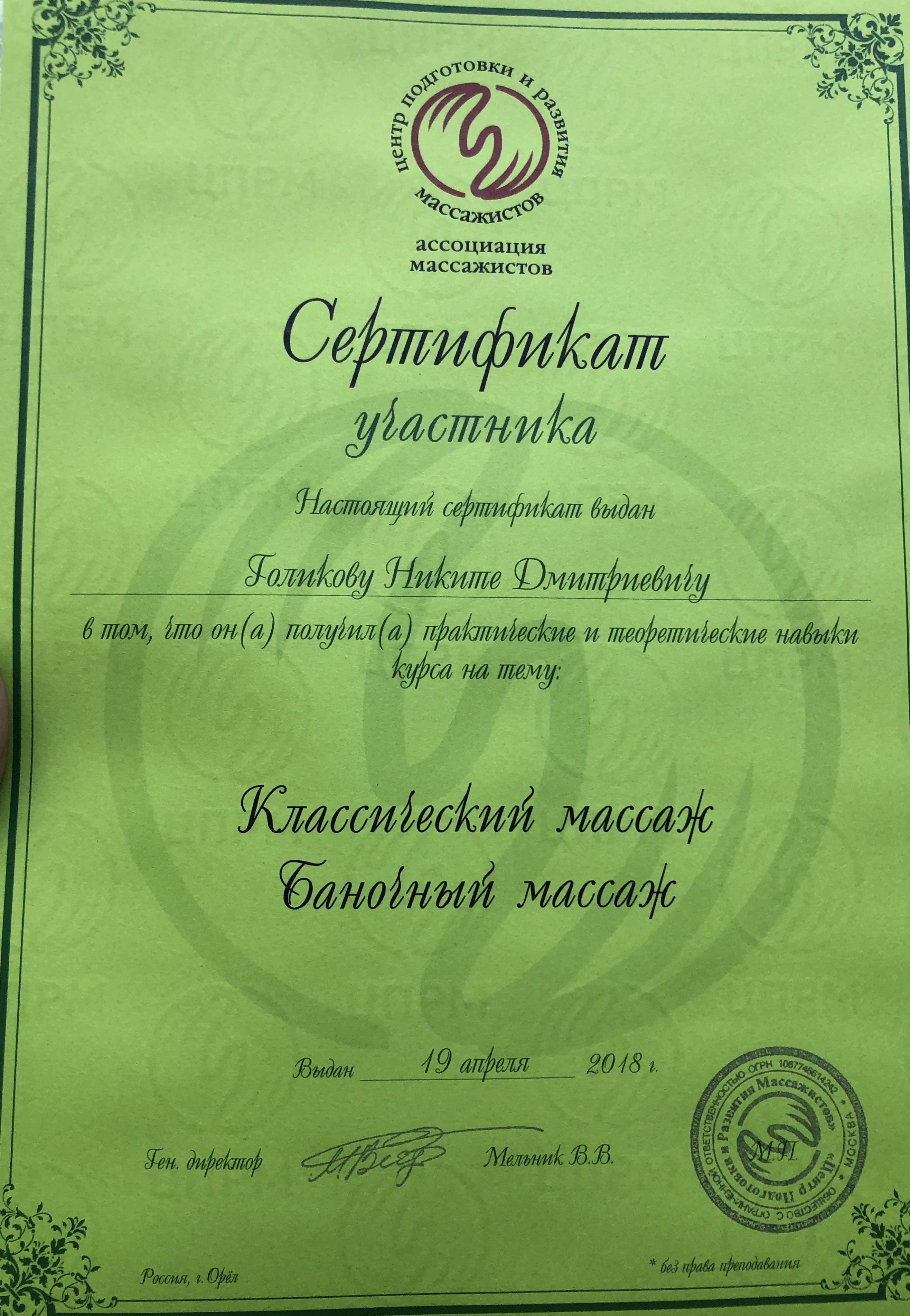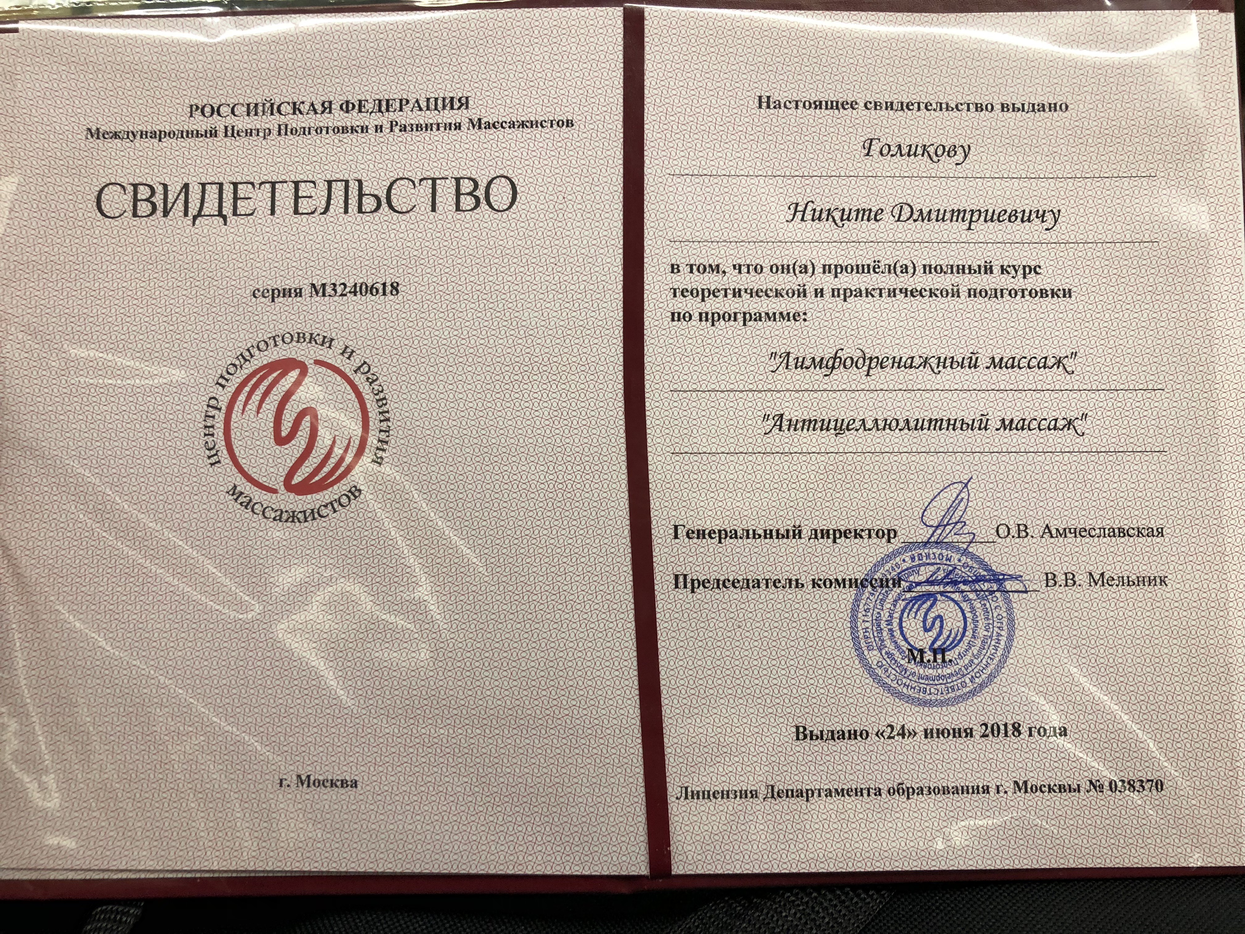 ➖Проходил обучение по курсам «Спортивного массажа» в мае 2018 года (Центр подготовки и развития массажистов, г. Москва). ➖«Антицеллюлитного массажа» и «Лимфодренажного массажа» в июне 2018 года (Центр подготовки и развития массажистов, г. Москва).